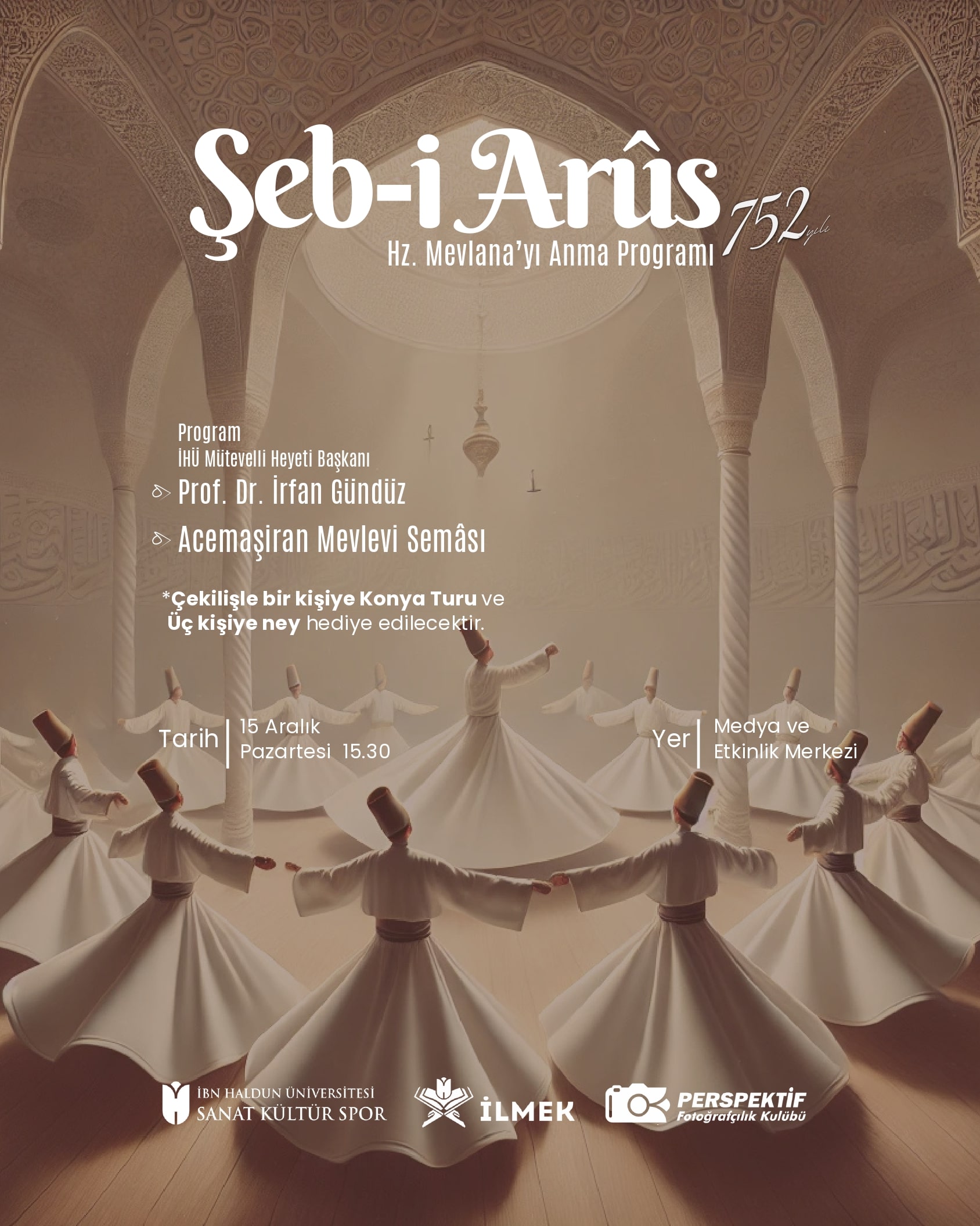 Sanat, Kültür ve Spor Daire Başkanlığı ile İslam Medeniyeti Kulübü (İLMEK) ve Perspektif ve Fotoğrafçılık Kulübü’nün katkılarıyla, 752. Vuslat Yılında Hz. Mevlana’yı anıyoruz. Hz. Mevlana’nın “Düğün Gecem” olarak nitelendirdiği bu müstesna gecede tüm akademisyenlerimizi, öğrencilerimizi ve idari personelimizi aramızda görmekten memnuniyet duyarız.