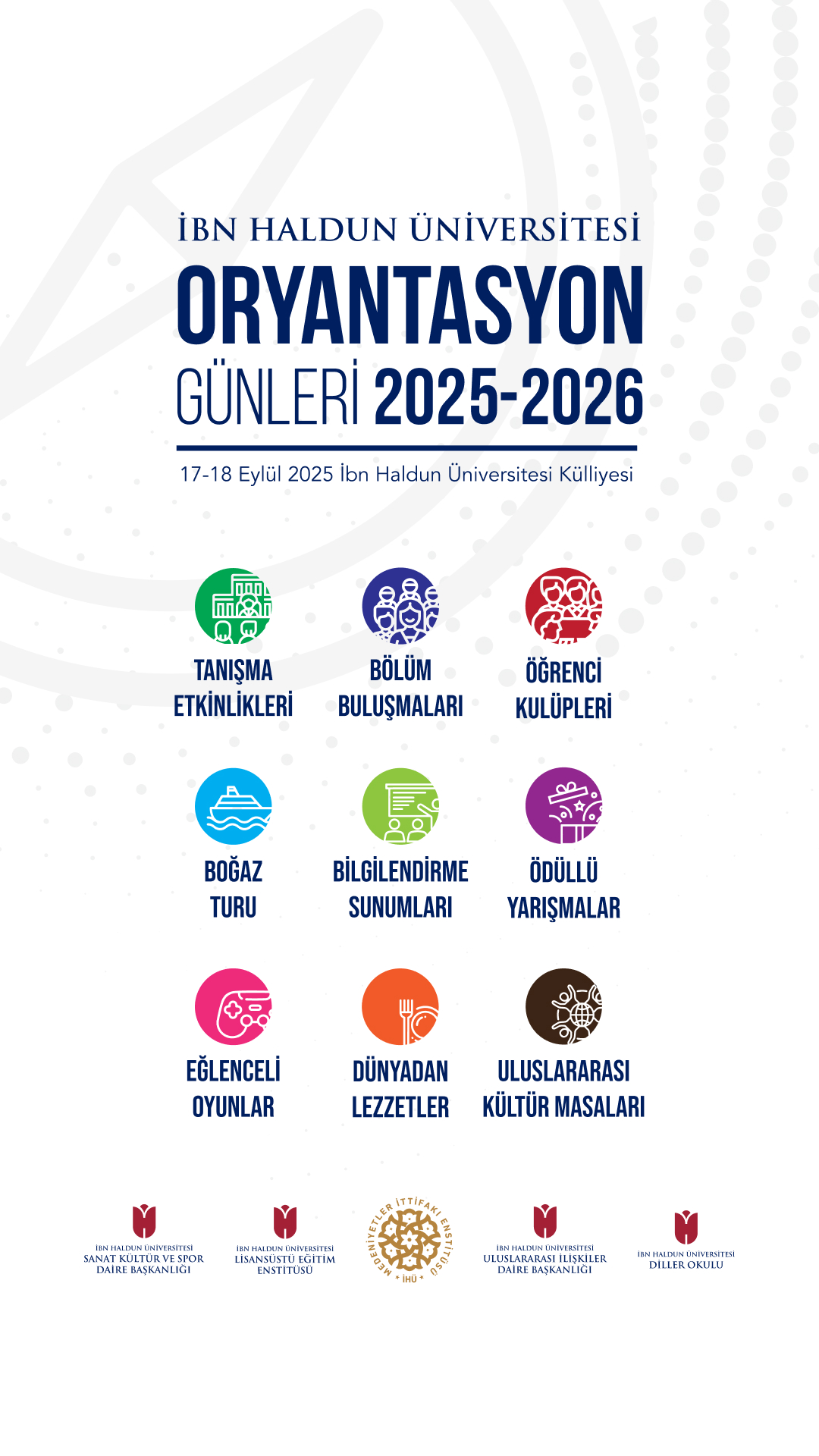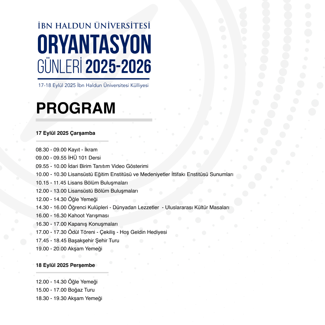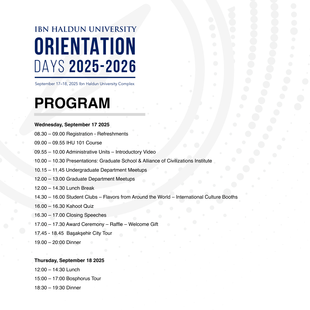2025-2026 Akademik yılının başlangıcında, 2025 yılı içerisinde yeni kaydolan lisans ve lisansüstü öğrencilerimizi karşılamak amacıyla hazırlanan İHÜ Oryantasyon Günleri, 17-18 Eylül 2025 tarihlerinde gerçekleştirilecektir.
