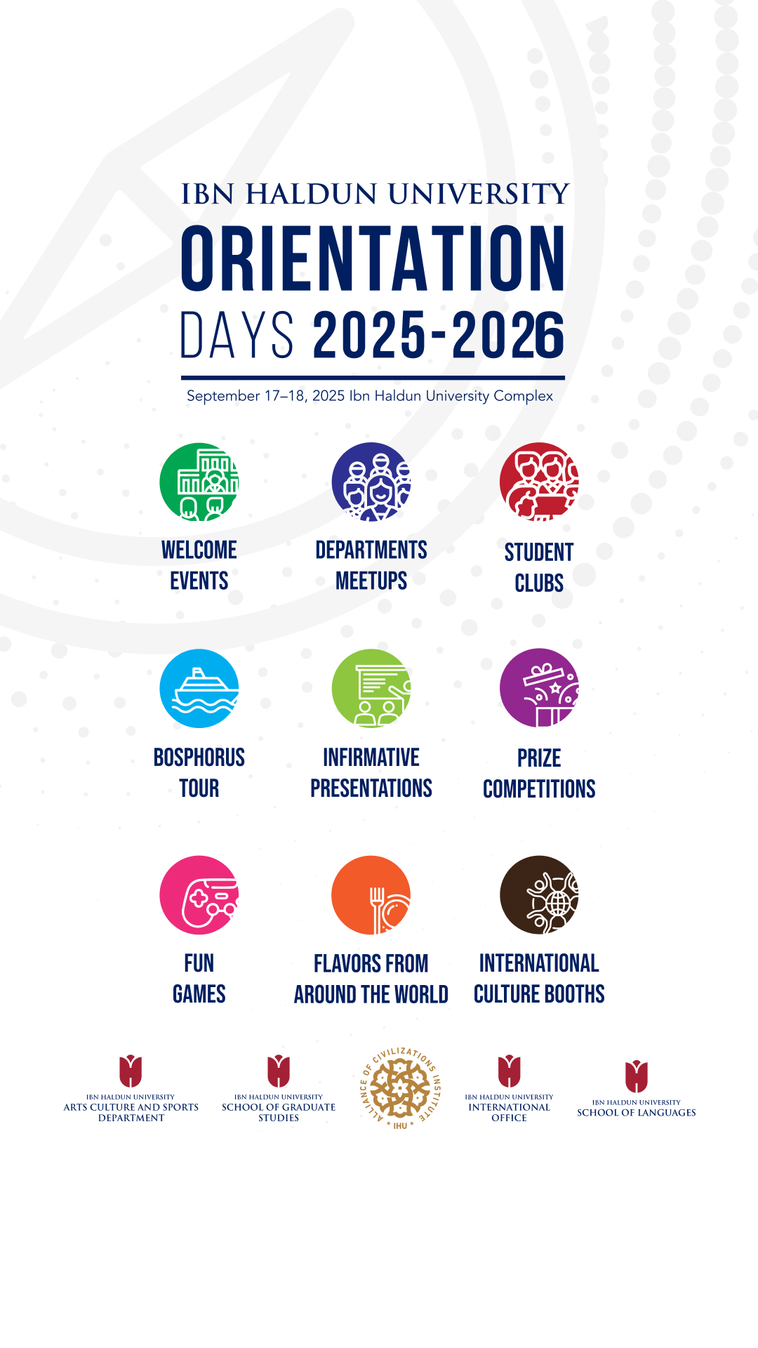 IHU 101 Course, departmental meet-ups, unit introductions, Kahoot competitions, student club stands, flavors from around the world, international culture tables, Bosphorus tour by ferry, city tour, prize draws, and a closing ceremony — all packed into a vibrant program!