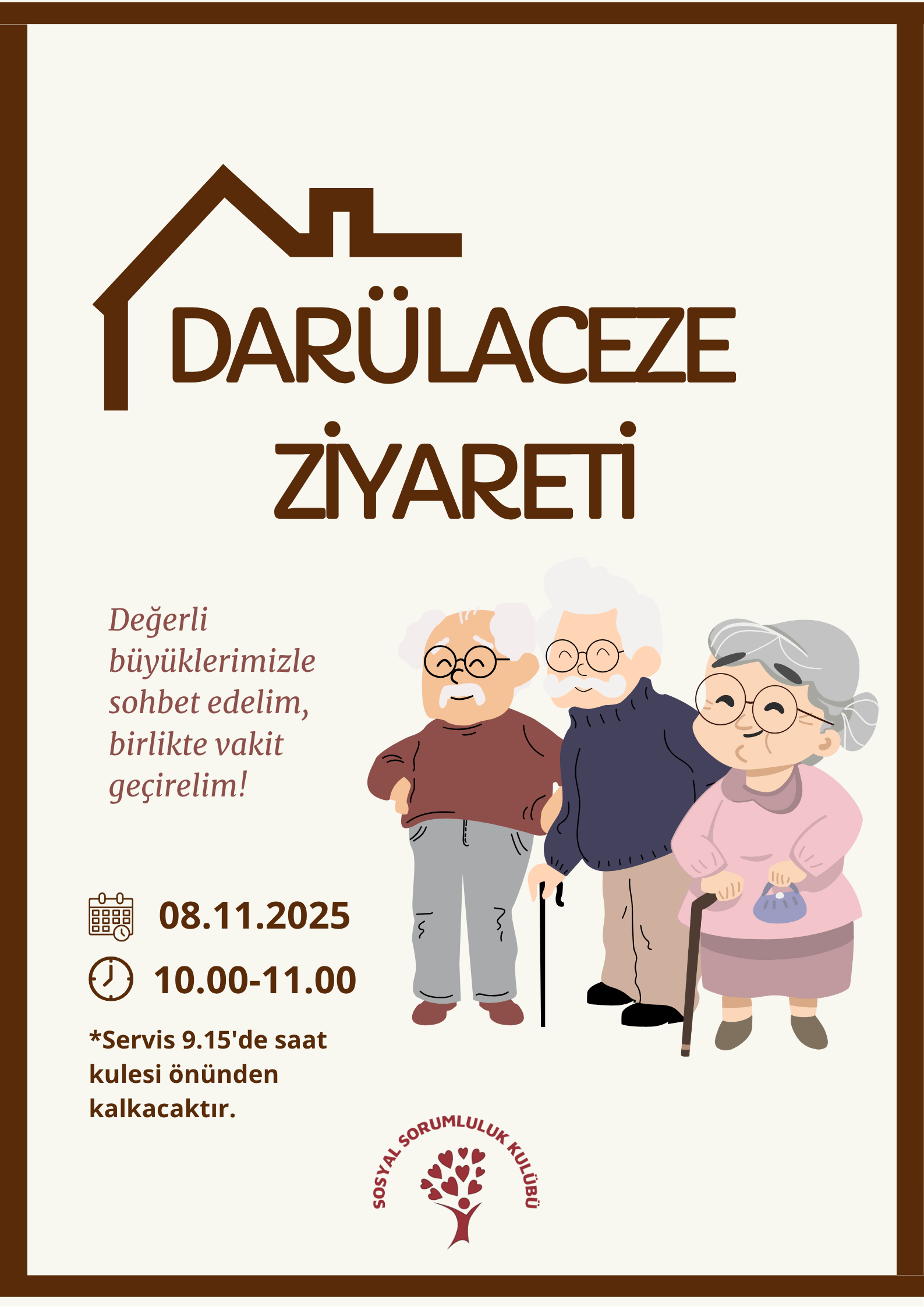 Bu etkinlik, Darülaceze’de yaşayan yaşlı bireylerle bir araya gelerek onlara moral vermek, sohbet edip güzel vakit geçirmek amacıyla düzenlenmiştir. Amacımız, onların yaşam tecrübelerinden faydalanırken yalnız olmadıklarını hissettirmek ve kuşaklar arası dayanışmayı güçlendirmektir. Küçük bir sohbetin, içten bir gülümsemenin bile mutluluk yaratabileceğine inanarak, bu buluşmada hem biz hem de büyüklerimiz için unutulmaz anılar biriktirmeyi hedefliyoruz.