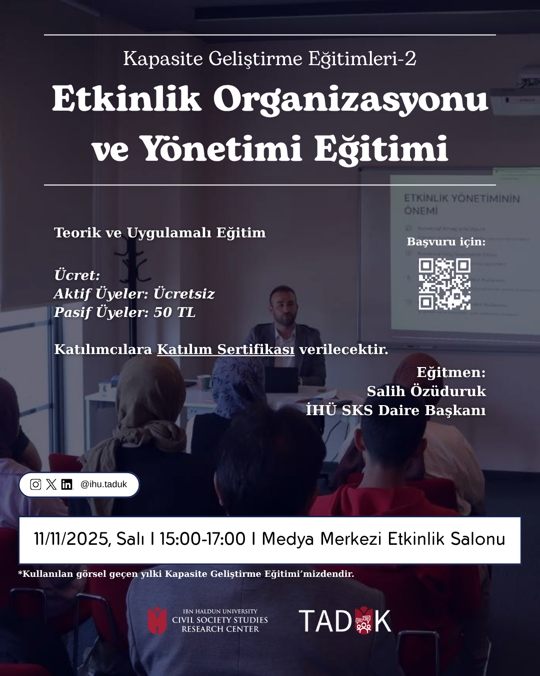 Eğitim kapsamında; etkinlik yönetiminde stratejik planlama, zaman ve kaynak kullanımı, ekip koordinasyonu, risk analizi ve değerlendirme süreçleri ele alınacaktır. Bu sayede katılımcıların, sınırlı kaynaklarla maksimum etki oluşturabilecek, ölçülebilir ve sürdürülebilir etkinlikler tasarlayabilme yetkinliği kazanmaları amaçlanmaktadır.