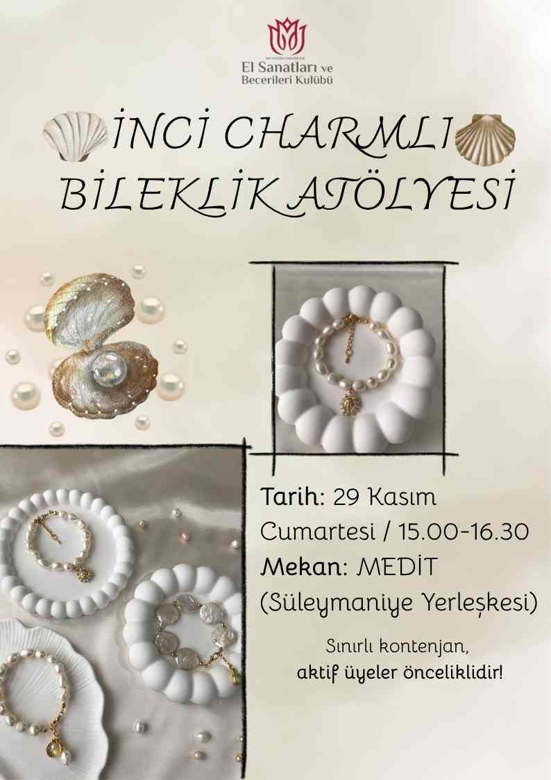 İnci Charmlı Bileklik Atölyesi’nde kendi tarzınızı yansıtan zarif bir bileklik tasarlarken takı yapımının inceliklerini öğrenme fırsatı bulacaksınız. El emeğinizle oluşturacağınız bu özel parça, hem kişisel bir hatıra hem de estetik bir deneyim olacak. Ayrıca, katılımcılarımıza özel küçük hediyelerimiz de sizleri bekliyor.