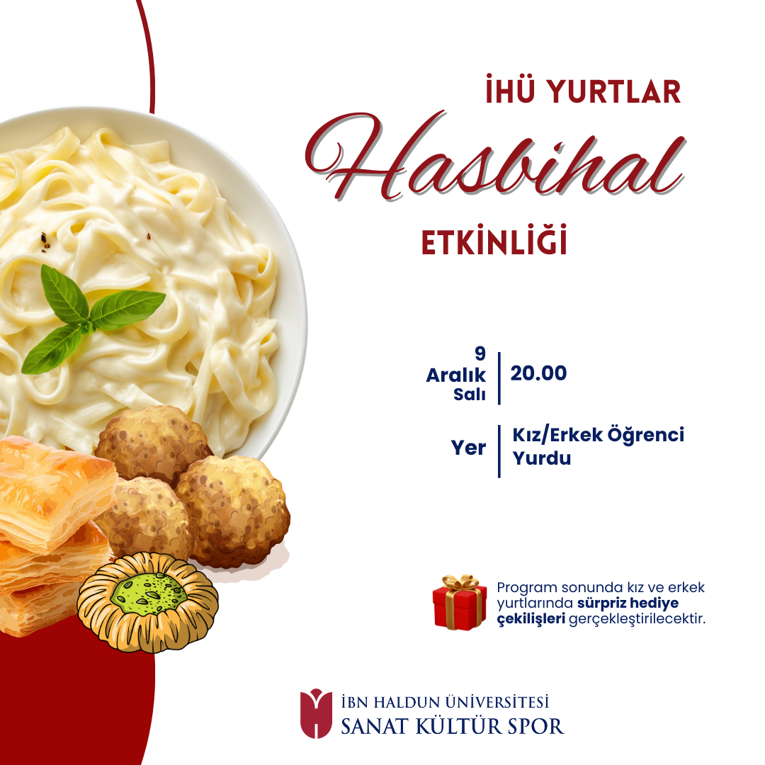 İbn Haldun Üniversitesi kız ve erkek öğrenci yurdu öğrencilerimizle birlikte, 9 Aralık Salı günü saat 20:00'de birbirinden lezzetli ikramlar eşliğinde hasbihal programı gerçekleştirilecektir.