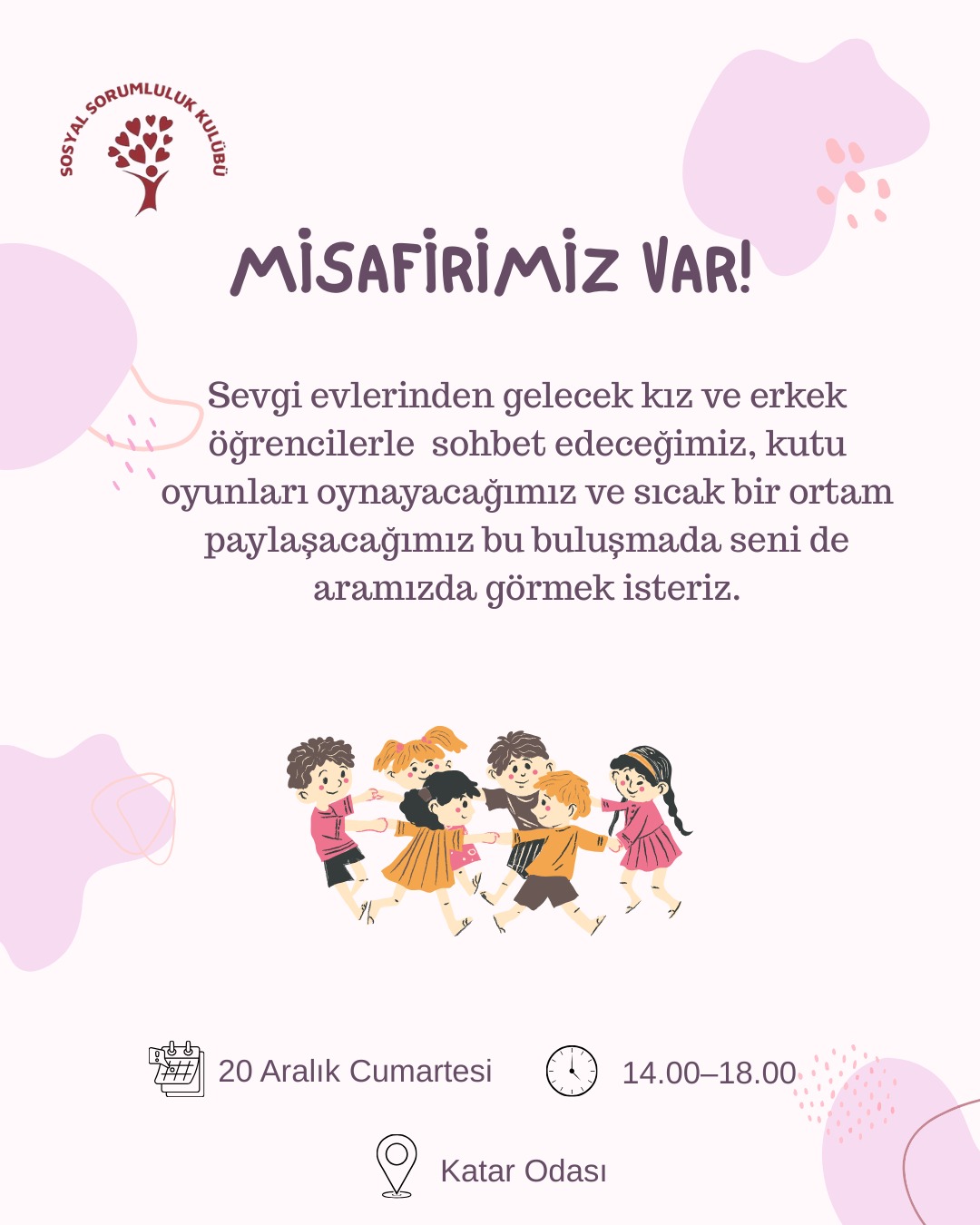 Bu etkinliğin amacı, sevgi evlerinde yaşayan ortaokul ve lise düzeyindeki öğrencileri okulumuzda misafir ederek onlarla sıcak ve destekleyici bir sosyal ortamda bir araya gelmektir. Kutu oyunları, sohbetler ve tanışma aktiviteleri aracılığıyla öğrenciler arasında sosyal bağlar kurmak, paylaşımı artırmak ve onların kendilerini değerli ve dahil hissedecekleri bir deneyim sunmak hedeflenmektedir. Bu buluşma, hem sosyal sorumluluk bilincimizi güçlendirmek hem de öğrencilerin sosyal ve duygusal gelişimlerine katkıda bulunmak için planlanmıştır.