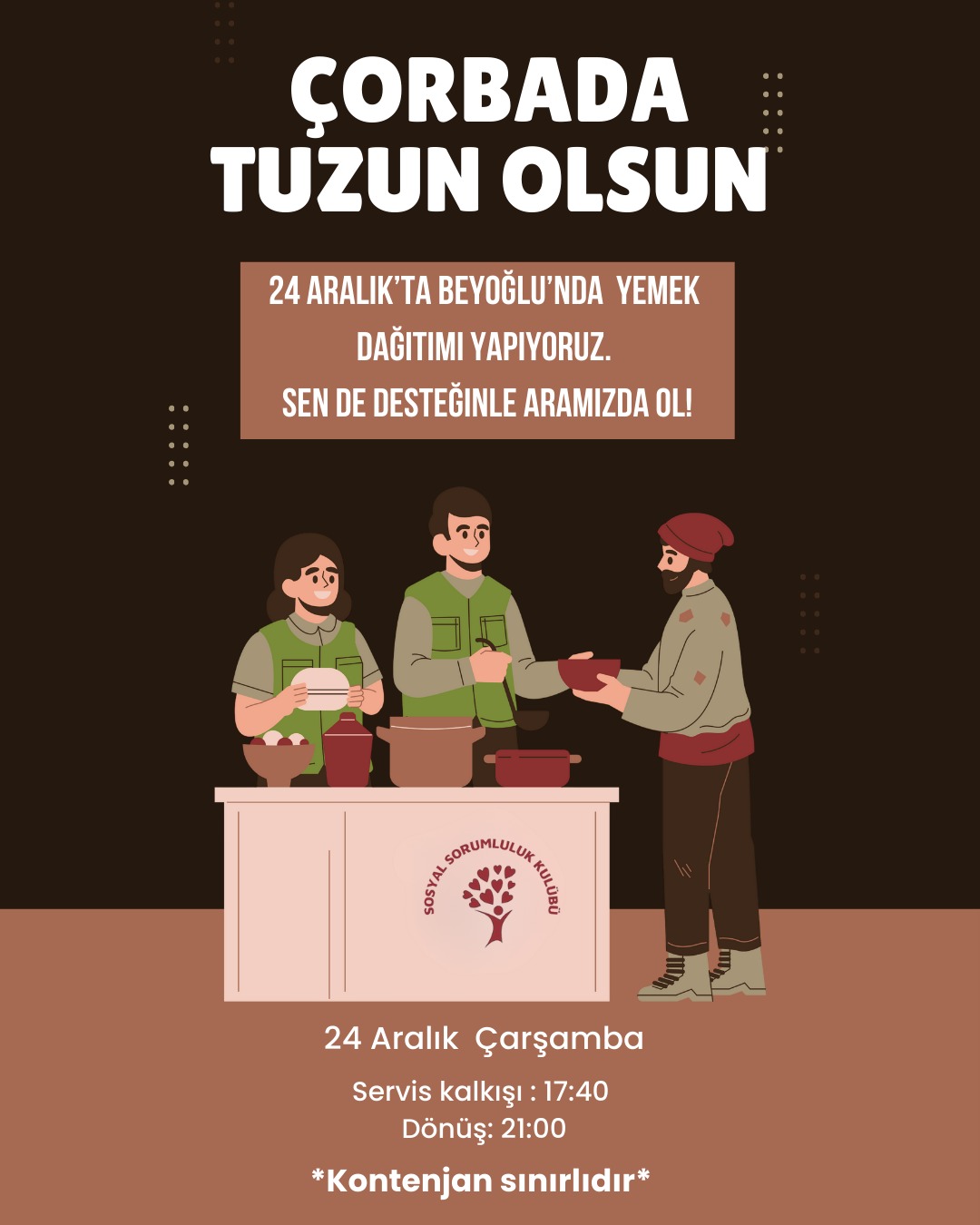 Bu etkinliğin amacı, Çorbada Tuzun Olsun Derneği ile birlikte yürütülen sosyal sorumluluk çalışmasında evsiz bireylere sıcak yemek dağıtımına destek olmaktır. Bu süreçte hem dayanışma kültürünü güçlendirmek hem de toplumun dezavantajlı bireylerine yönelik farkındalık oluşturmak hedeflenmektedir. Etkinlik, katılımcıların sosyal sorumluluk bilincini artırmayı, empati geliştirmeyi ve toplumsal dayanışmaya aktif katkı sunmayı amaçlamaktadır.