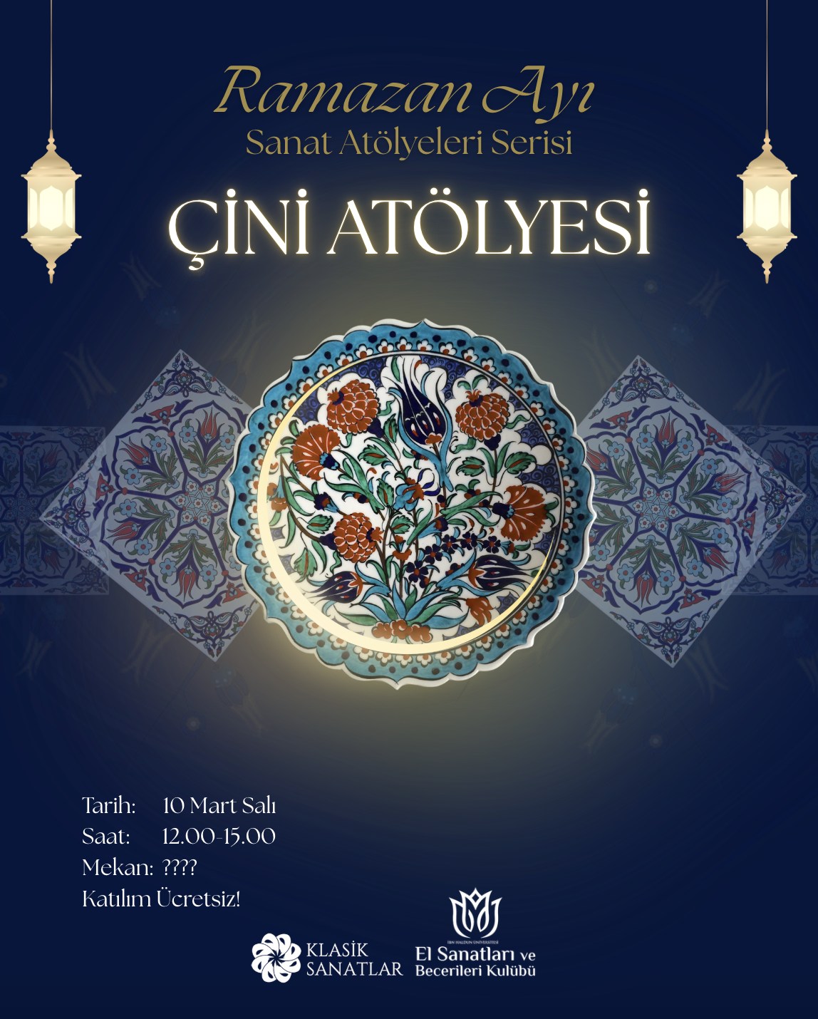 Bu hafta sanat atölyemizde, Ramazan Ayı Sanat Atölyeleri Serisi’nin ve Ramazan ayının son etkinliği olan Çini Yapımı Atölyesi ile sizlerle bir araya geliyoruz. Bu atölyede, çini yapım sürecini uygulamalı olarak deneyimleyecek; desen, renk ve form üzerine çalışarak kendi özgün çalışmalarınızı oluşturacaksınız. Atölyemiz her seviyeden katılımcıya açıktır ve herhangi bir ön bilgi gerektirmemektedir.