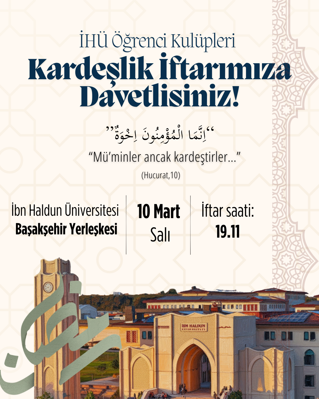 Ramazan ayının bereketini ve birleştirici gücünü hep birlikte hissetmek adına İHÜ Öğrenci Kulüpleri olarak düzenlediğimiz Kardeşlik İftarında bir araya geliyoruz. Aynı sofrada buluşmak, kardeşlik bağlarımızı güçlendirmek ve Ramazan’ın manevi iklimini paylaşmak için hepinizi aramızda görmekten mutluluk duyarız.