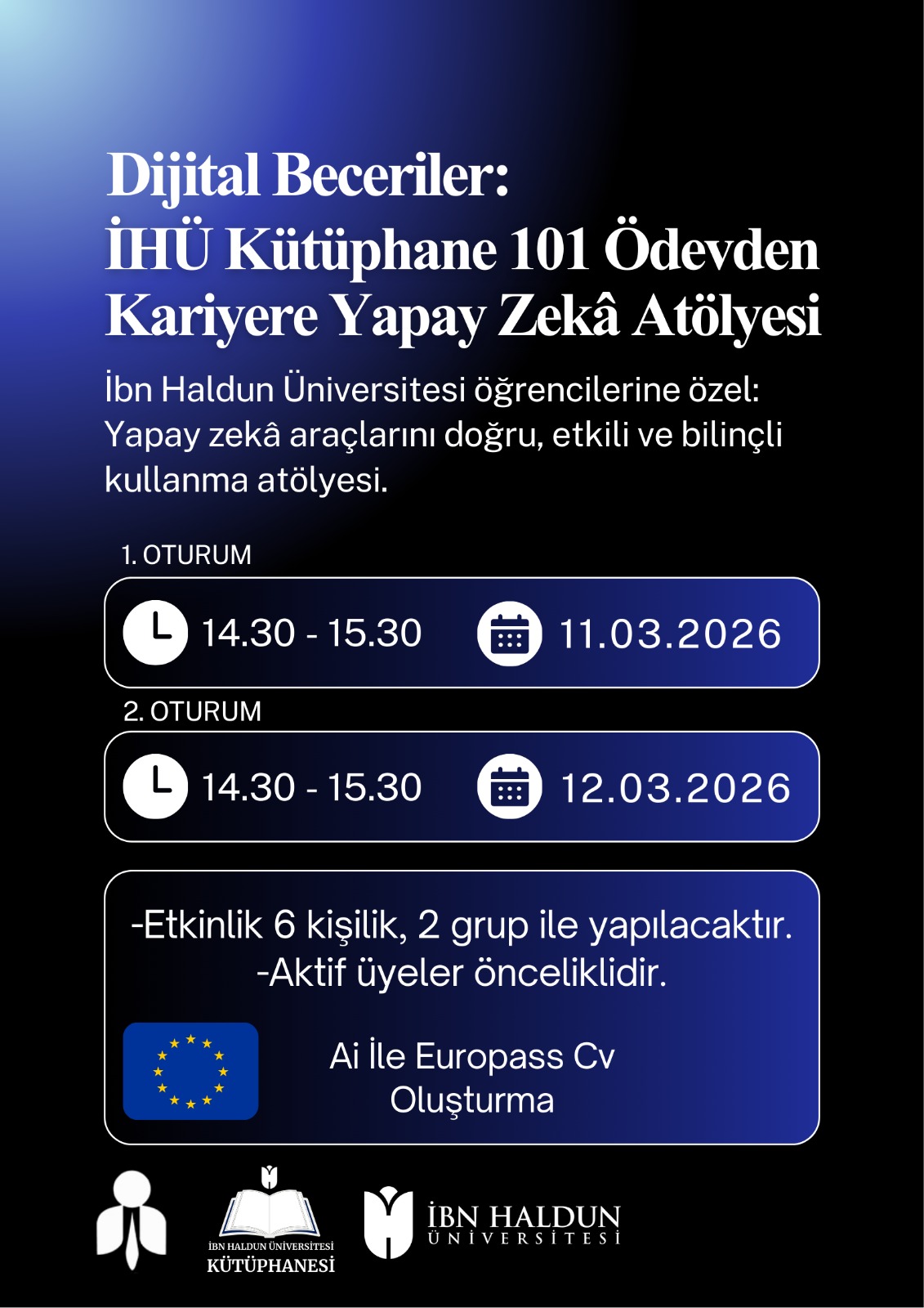 Bu atölyede katılımcılar, yapay zekâ araçlarını kullanarak *Europass CV oluşturma, dijital becerileri kariyer gelişiminde etkin şekilde kullanma, akademik ödevlerde yapay zekâ kullanma, yapay zekâyı etik ve sorumlu kullanma ve yapay zekânın sunduğu fırsatları keşfetme imkânı bulacaktır. Program, teorik bilgiyi pratik uygulamalarla birleştirerek katılımcıların dijital yetkinliklerini geliştirmeyi amaçlamaktadır.