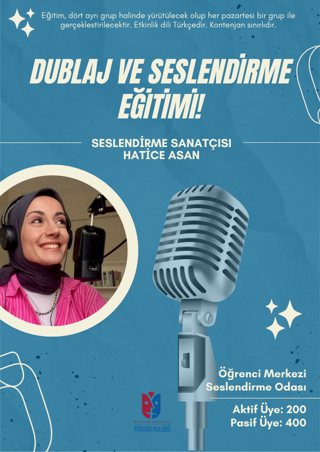 Çok sevilen Dublaj ve Seslendirme atölyemizi sizler için yeniden başlatıyoruz. Seslendirme sanatçısı Hatice Asan rehberliğinde gerçekleştireceğimiz bu eğitimlerde, seslendirme sanatının temel tekniklerini ve inceliklerini birlikte öğreneceğiz.