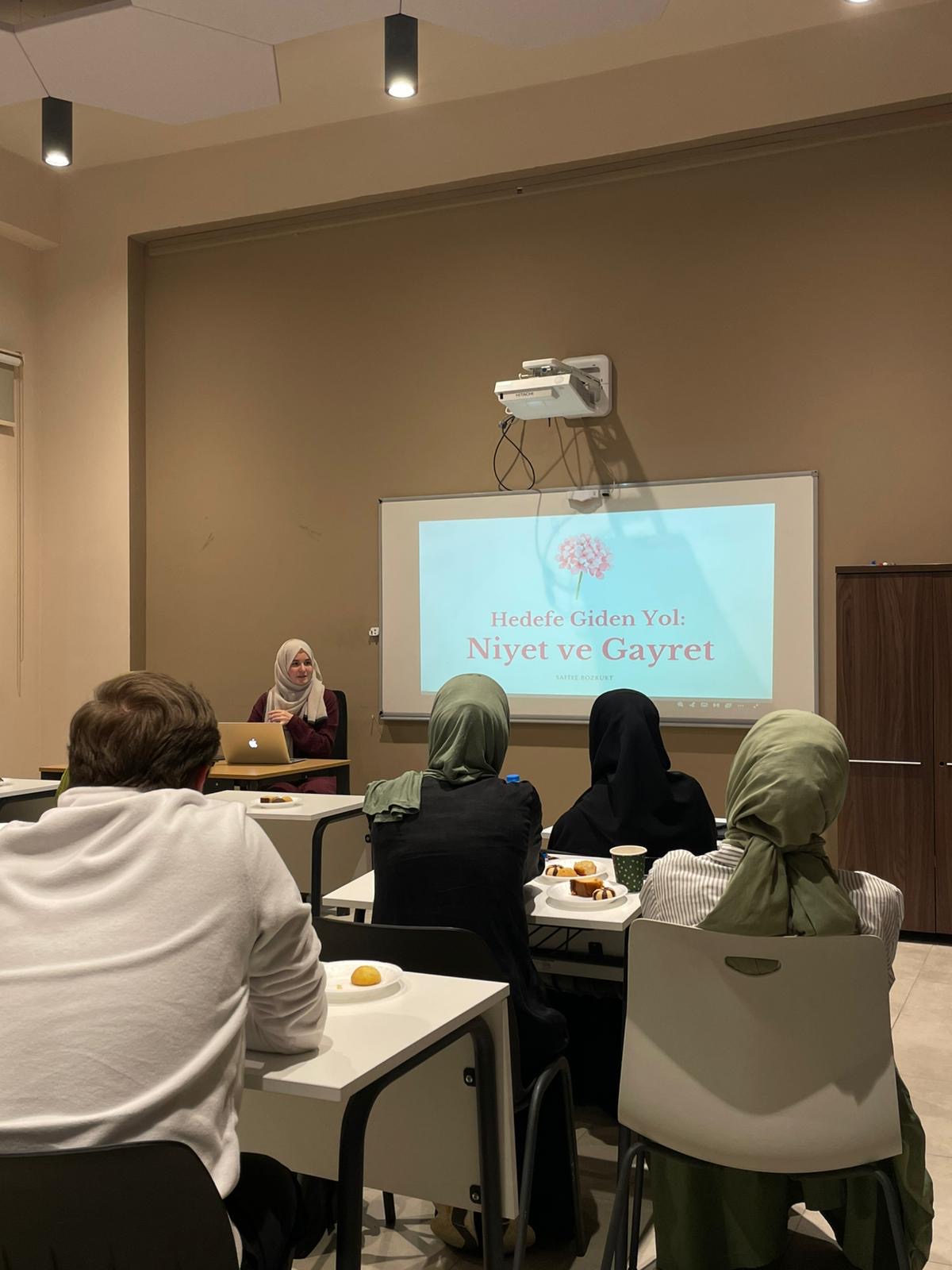 İslam Medeniyeti Kulübü, öğrencilerin kişisel gelişim ve motivasyonunu desteklemek amacıyla 09 Ekim 2025 tarihinde ""Hedefe Giden Yol: Niyet ve Gayret"" başlıklı bir söyleşi düzenledi. Yoğun ilgi gören etkinlikte, hedeflere ulaşmada manevi temel olan ""niyetin samimiyeti"" ve ""sürekli gayretin"" dönüştürücü gücü ele alındı. Söyleşi, öğrencilere akademik ve kişisel hayatlarında motivasyonlarını koruma ve hedeflerine odaklanma konusunda değerli bir rehberlik sundu.