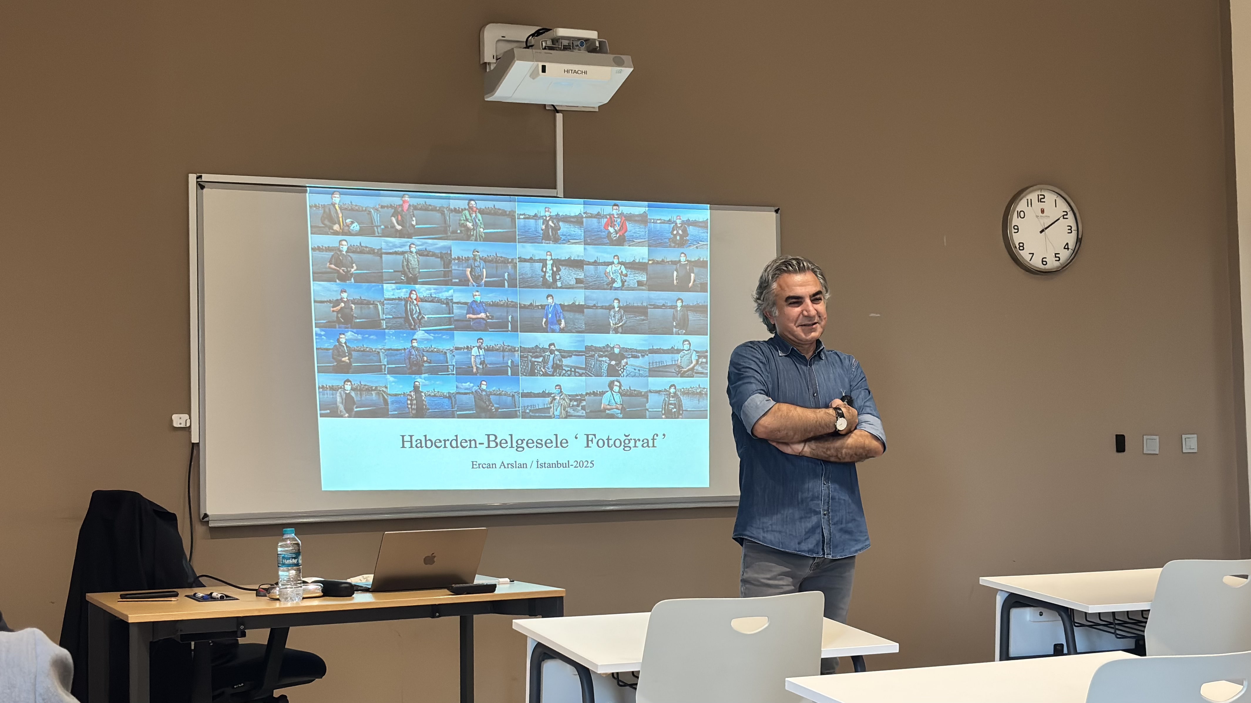 Perspektif ve Fotoğrafçılık Kulübü, 19 Kasım 2025 tarihinde Basic Photography dersi kapsamında fotoğraf dünyasının deneyimli isimlerinden Ercan Arslan’ı ağırlayarak öğrenciler için ilham verici bir öğrenim ortamı sundu. Milliyet Gazetesi’nde uzun yıllar Foto Muhabiri ve Fotoğraf Editörü olarak görev yapan Arslan, belgesel fotoğrafçılığına dair birikimlerini paylaşarak mesleğin inceliklerini, sahada karşılaşılan zorlukları ve etkili hikâye anlatımının temel ilkelerini aktardı.